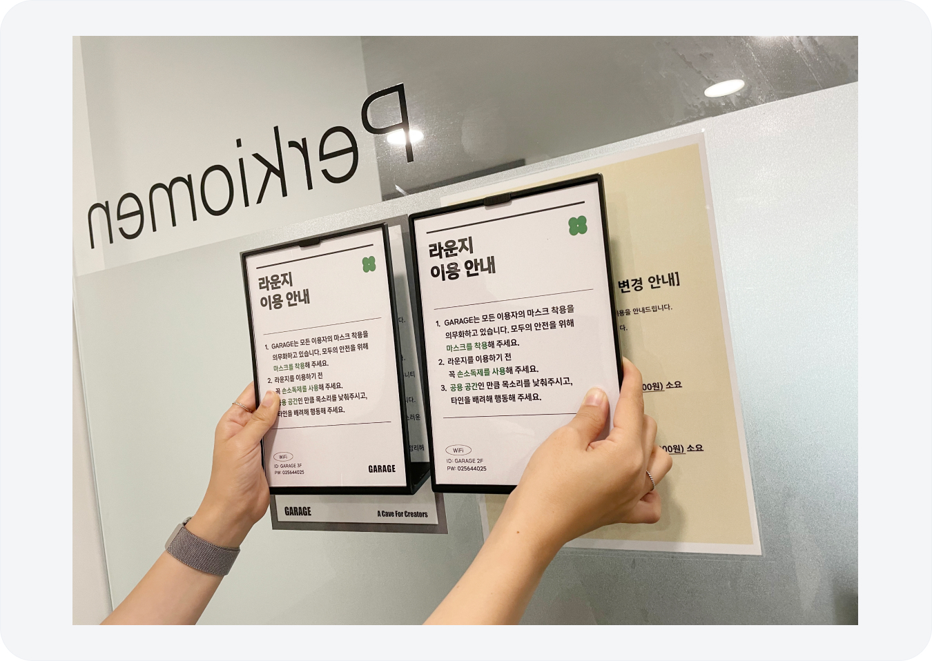 회의실 안내문 같은 경우는 너무 눈에 띄어 회의하는 가라지 멤버분들의 집중을 방해할 것 같았습니다.