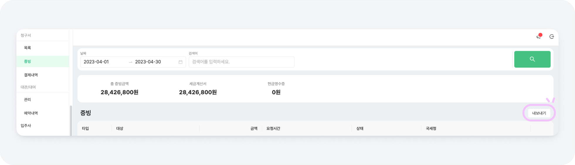 [증빙] 탭에서 조회를 원하는 기간을 선택*한 후 [내보내기] 버튼을 눌러 엑셀 파일로 저장해
