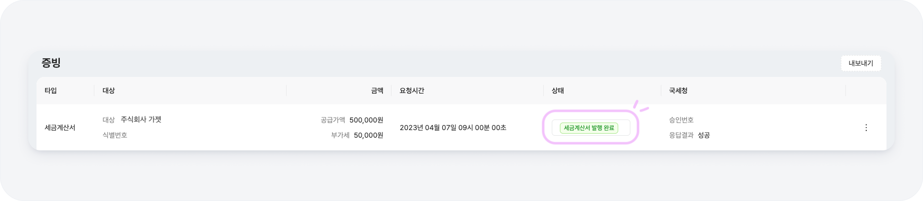 확인을 원하는 증빙 내역의 [세금계산서 발행 완료] 버튼을 클릭해 보세요.