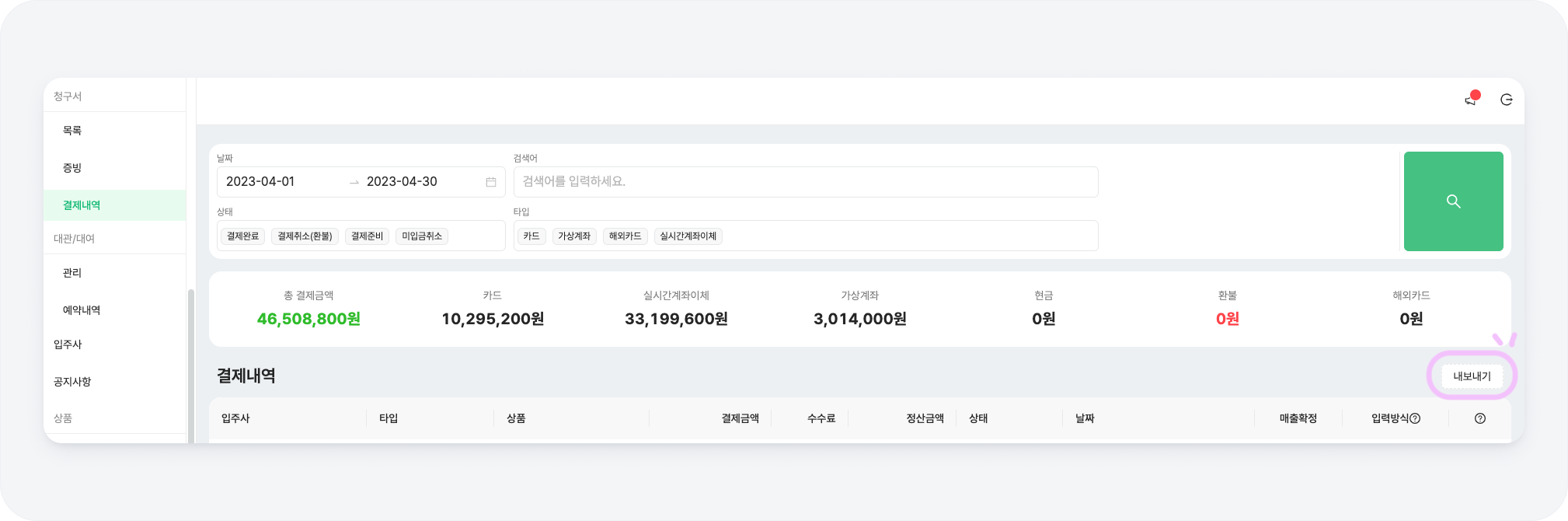 [결제내역] 탭에서 조회를 원하는 기간을 선택*한 후 [내보내기] 버튼을 눌러 엑셀 파일로 저장해