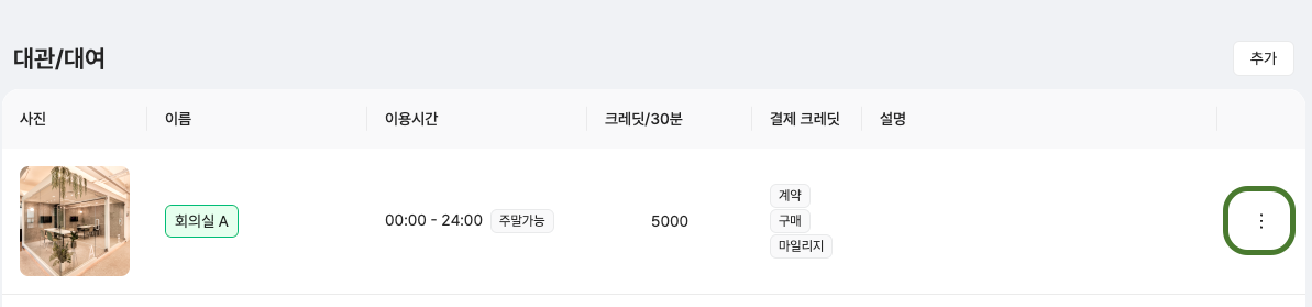 1) 대관/대여 메뉴의 더보기(︙) 버튼 -> 수정을 눌러주세요